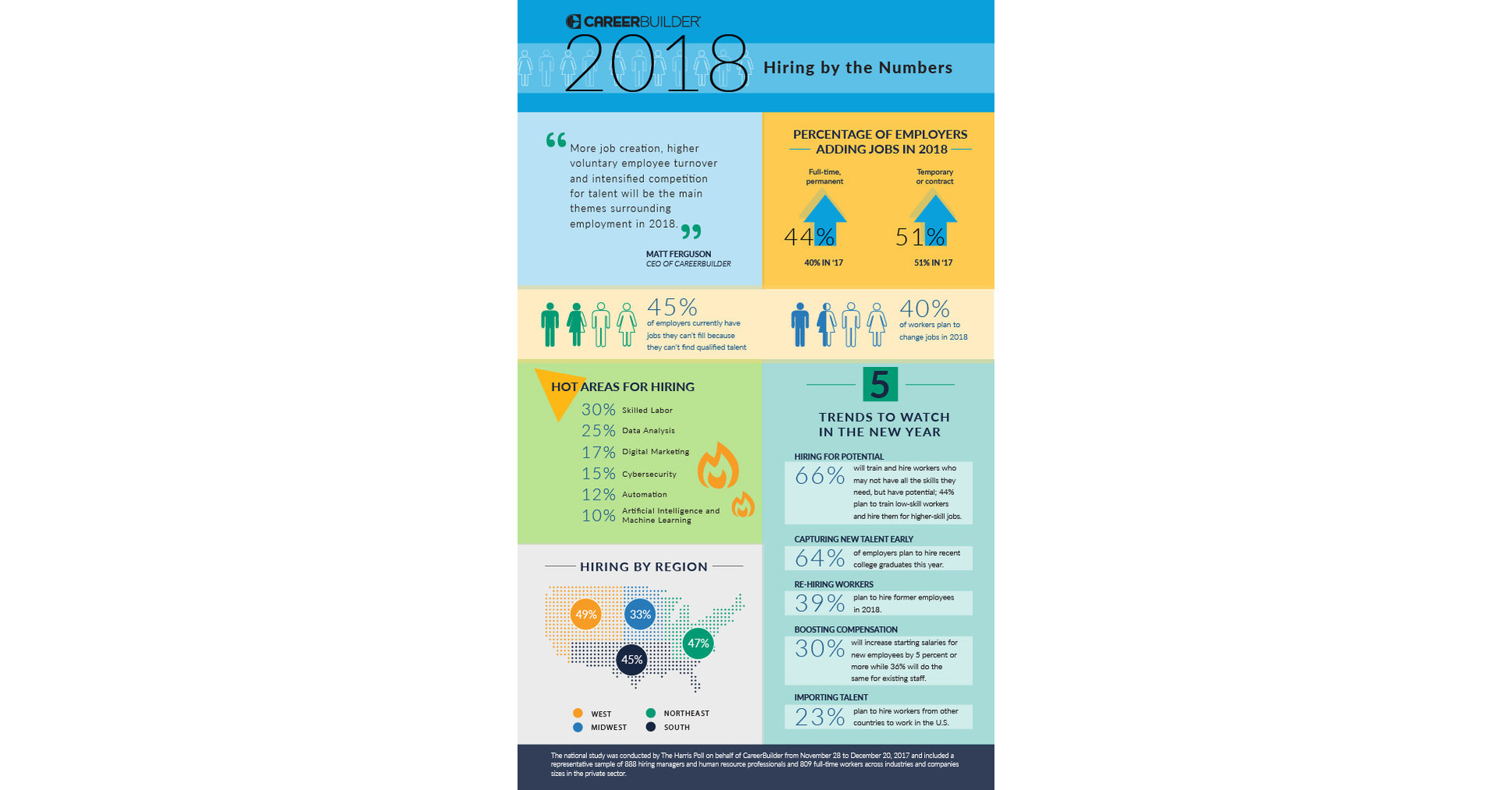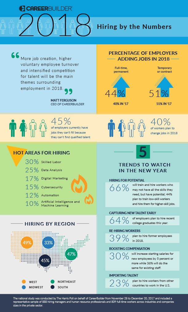 “More job creation, higher voluntary employee turnover and intensified competition for talent will be the main themes surrounding employment in 2018,” said Matt Ferguson, CEO of CareerBuilder and co-author of The Talent Equation. “There is a perfect storm happening in the U.S. labor market. Low unemployment paired with lagging labor force participation and a growing skills gap is making it very difficult for businesses to find qualified candidates – and this is for all types of roles. If employers want to remain competitive, they are going to have to look to new talent pools and significantly increase their investment in training workers to build up the skills they require.”