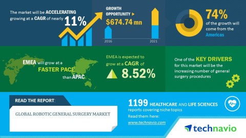 LONDON-(BUSINESS WIRE)-The latest market research report by Technavio on the global robotic general surgery market predicts a CAGR of close to 11% during the period 2017-2021.