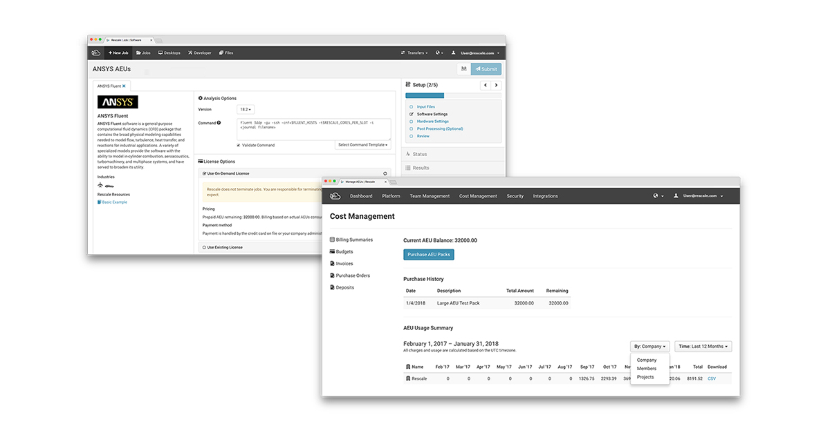 With Rescale, customers achieve the ultimate flexibility by being able to run existing traditional licenses and purchase pay-per-use licensing on ScaleX, as well as access a variety of hardware architectures via bare metal and virtual servers and their on-premises infrastructure. In addition, the ScaleX administration portal allows company administrators to monitor and control their company’s AEU usage by setting budgets at the user, project, and company levels.