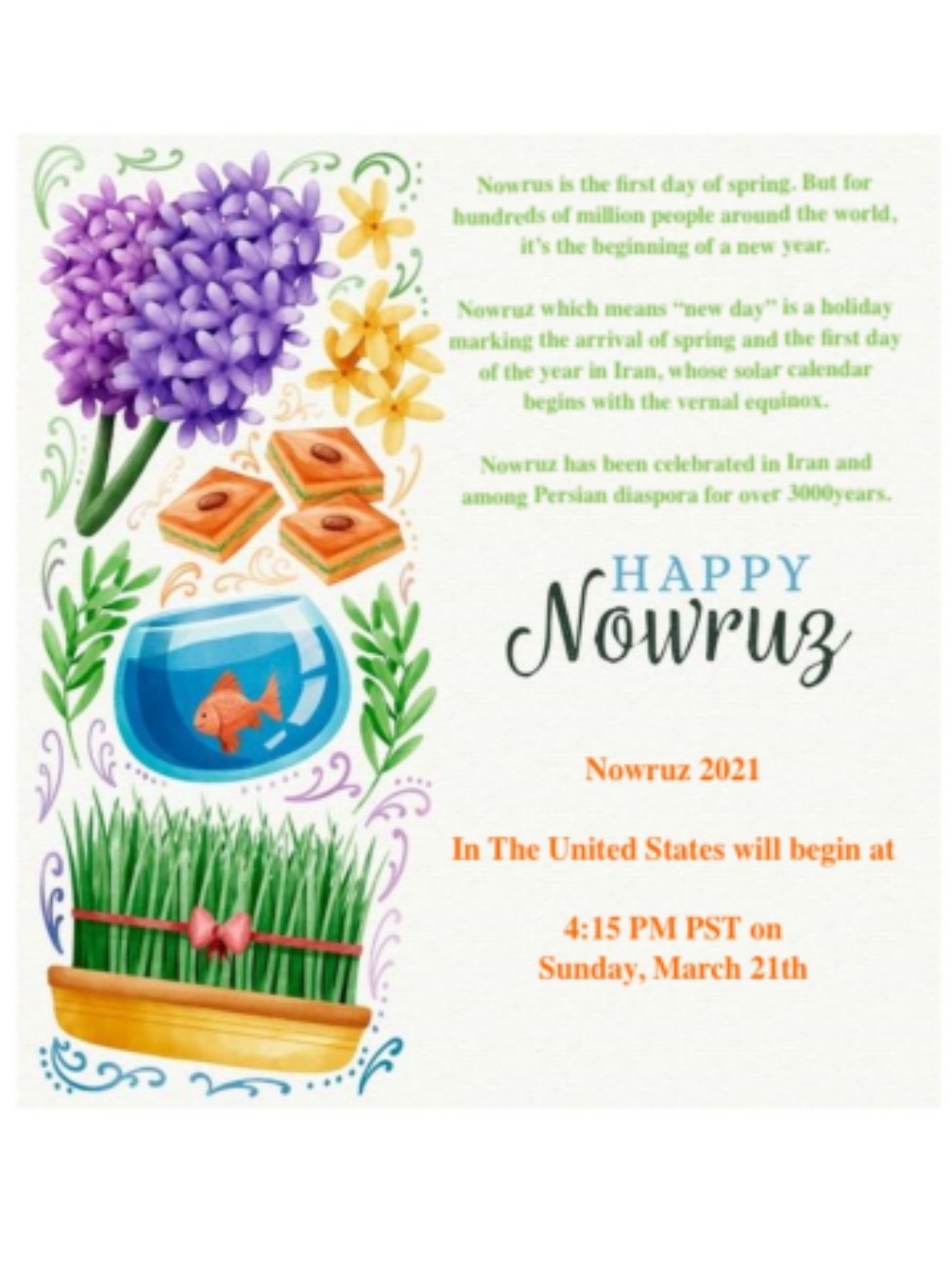 This is a tradition that dates back over 3,000 years. Spring has always been a time of celebration in many cultures. It is the end of the cold winter months and marks the new life that comes with Spring. Nowruz will officially start on March 21st at 4:15 pm PST. We encourage everyone to take a moment and enjoy the New Year.