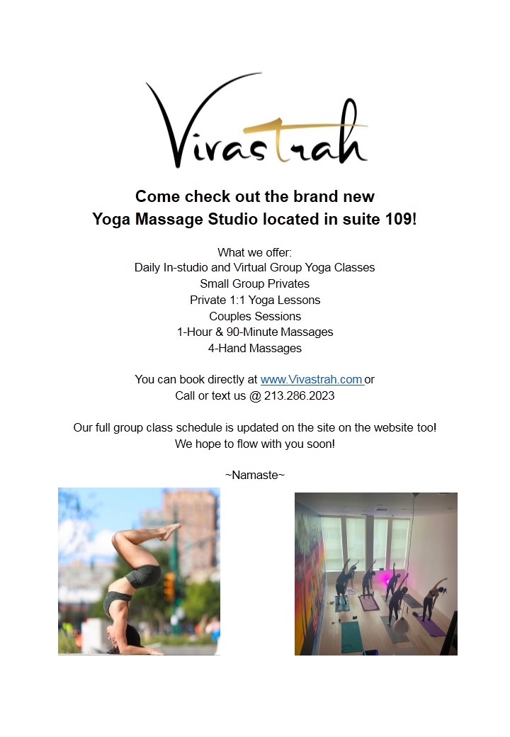 United States, California, Los Angeles - 02-16-2021 (PRDistribution.com) — TENTEN Wilshire would like to welcome Vivatrah Yoga and Massage Studio to the property. This distinguished yoga center provides daily in-person and virtual yoga sessions. Visitors to the center can also indulge in 60 or 90-minute massages. Vivatrah Yoga is located in Suite 109 and is currently offering in-person 1 on 1 yoga sessions, group classes, and virtual classes every day. All yoga classes are held outdoors and in compliance with all COVID-19 safety restrictions. Vivatrah also offers massages in 60 or 90-minute increments. Couples massages are available as well as four-hand massages. For more information on these fabulously relaxing massages or schedule an appointment, you are encouraged to stop by Suite 109 at 1010 Wilshire or visit Vivatrah’s website Vivatrah.com. Yoga has been shown to be a very effective exercise method, especially for those who need low-impact exercise methods. It is also a very relaxing exercise that is good for helping those who deal with high levels of stress. For those suffering from excessive stress, Vivatrah offers intense massage sessions that are sure to work out your muscles’ stress. TENTEN Wilshire encourages all residents to take advantage of Vivatrah and all of the other businesses that call TENTEN Wilshire home.