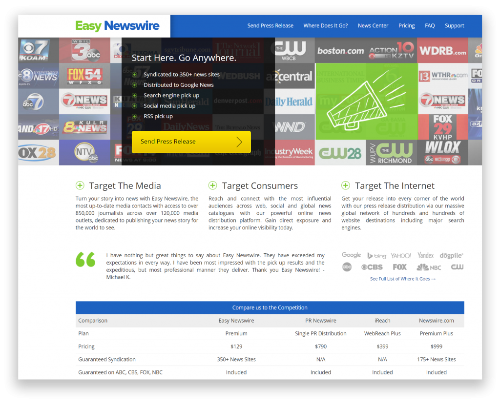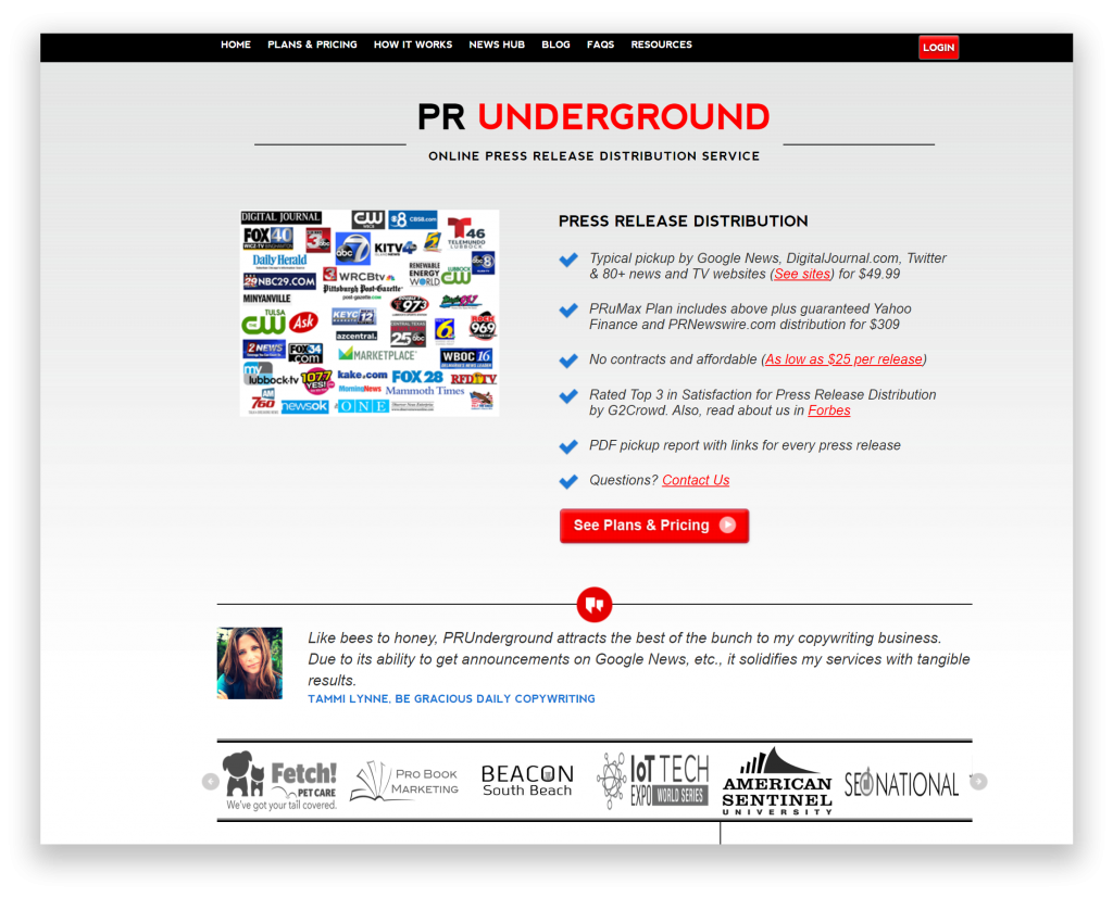 With a plan that goes for $129, PR Underground assures coverage in 375 media sites, including large networks like ABC, FOX, CBS, NBC, etc. This means that your press release is going on to meet a wide audience and with a variety of iThey also distribute content to Google, Bing News, industry journals, and blogs.