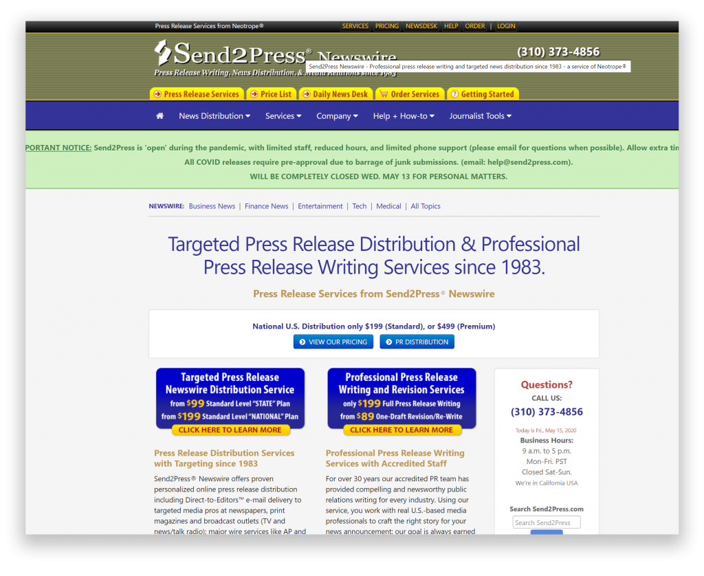 Send2Press was launched in 1997 as a press release distribution and writing service with affordable plans for small business owners and from as low as $29.For services starting from $89, they offer free proofreading and editing services; with multiple drafts for you to choose from.