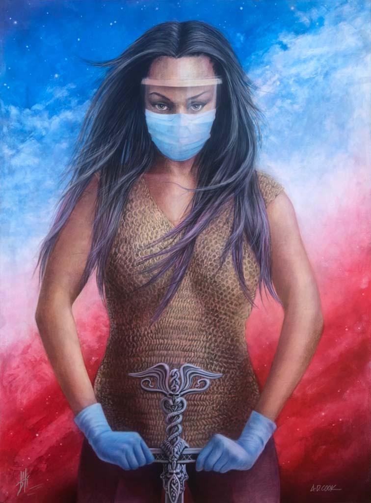 “It’s all about honoring the collective warrior essence of those who go above and beyond for others.” say co-creators A.D. Cook and Beti Kristof. The artists collaborative tribute honors nurses, doctors, and caregivers who have taken up a first-line defense against the global COVID 19 pandemic.