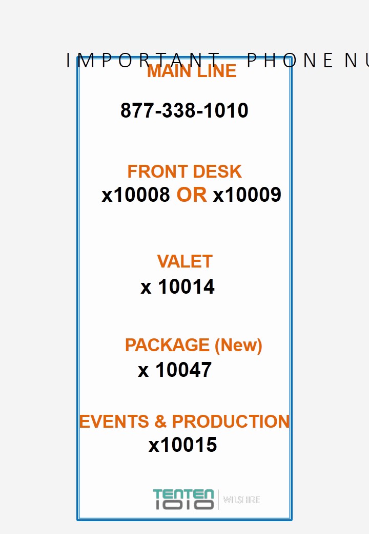 TENTEN Wilshire believes that part of living a luxury lifestyle is enjoying conveniences where you live. In an effort to enhance your amenities, we have reposted all of the important property phone numbers.